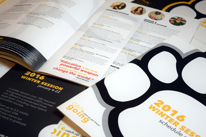 The UMBC Division of Professional Studies advertises yearly through a catalog design for summer and winter graduate and undergraduate courses. The summer session catalog is the largest, with the most course offerings, totaling 52 pages (inluding cover). Both 2016 catalogs were printed with a spot raised UV around the official university paw. The Grit Going wordmark, which I created in 2014, was featured throughout the design campaign, which included brochures, posters, and postcards and continues to be essential to ongoing campaign designs.