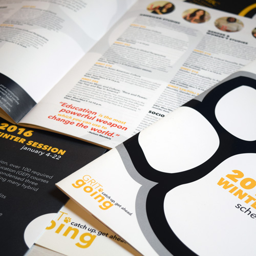 We could not be happier with the work Layla has done with the 2016 Winter and Summer Session catalogs. Her designs are eye-catching and have been well received among the student body. Layla was very easy to work with, open to critiques, and extremely quick with communication throughout the entire process, from the initial concept, to page layout and design, to the final product.