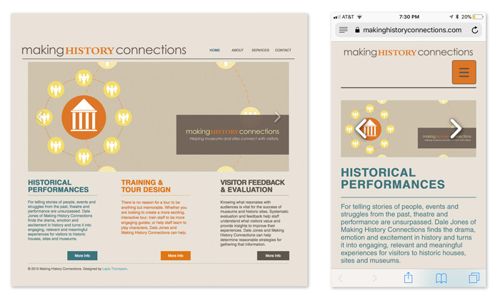 Making History Connections is a local business that helps museums and historic sites offer engaging programs and experiences for visitors through historical performances, staff training, and much more. The founder and owner needed a design refresh as well as the ability to update the site himself. After sharing a few options with him available in WordPress, SquareSpace, and Wix, the Wix template was selected and implemented. I transferred all the content from the client's previous site and placed it into the chosen template, and incorporated some additional design changes.