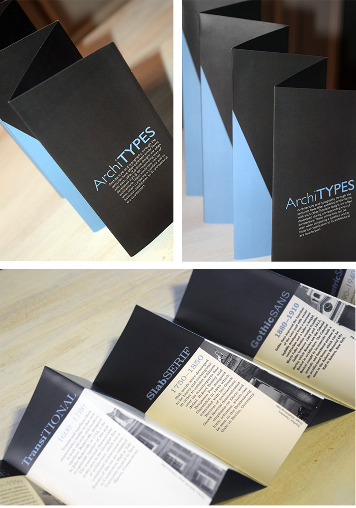 Architecture and typography have often exhibited similar shared forms and structure. Many popular typefaces were developed during architectural eras and mimicked their historical period counterpart. The similarities between a typeface design and its corresponding architectural era are highlighted in this informational brochure, which features a tiered "skyscraper-like," three-dimensional design of its own.