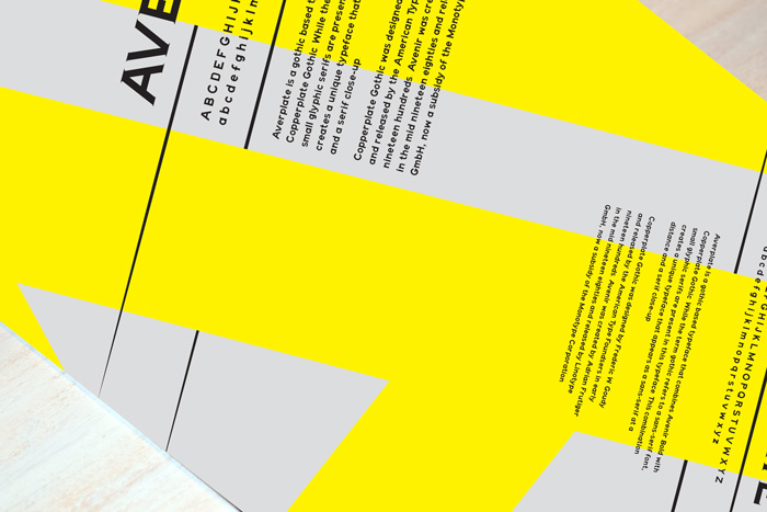 Averplate is a typeface designed through a combination of Avenir Next and Copperplate Gothic. While the term gothic usually refers to a sans-serf, small glyphic serifs are exhibited within this reimagined Copperplate Gothic typeface. The combination of Avenir Next and Copperplate Gothic creates a unique typeface that appears as a sans-serif from a distance, but a serif when viewed up close.