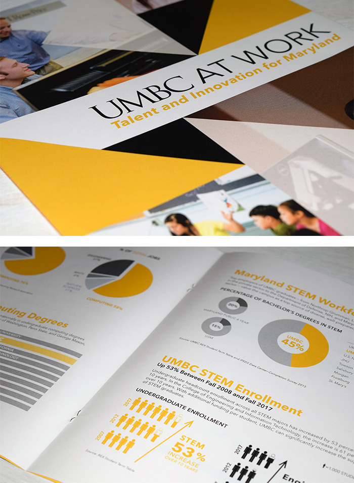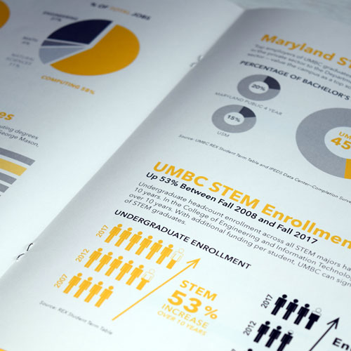 The Legislative Testimony occurs every 3 years in Annapolis, Maryland in order to secure support for a base funding increase for UMBC from the state. These infographics were created and used by the president of UMBC, Dr. Freeman Hrabowski, during his presentation in Annapolis to advocate for the additional funding. In addition to the printed materials used for the testimony, these graphics continue to be used across campus for digital presentations and on the web.