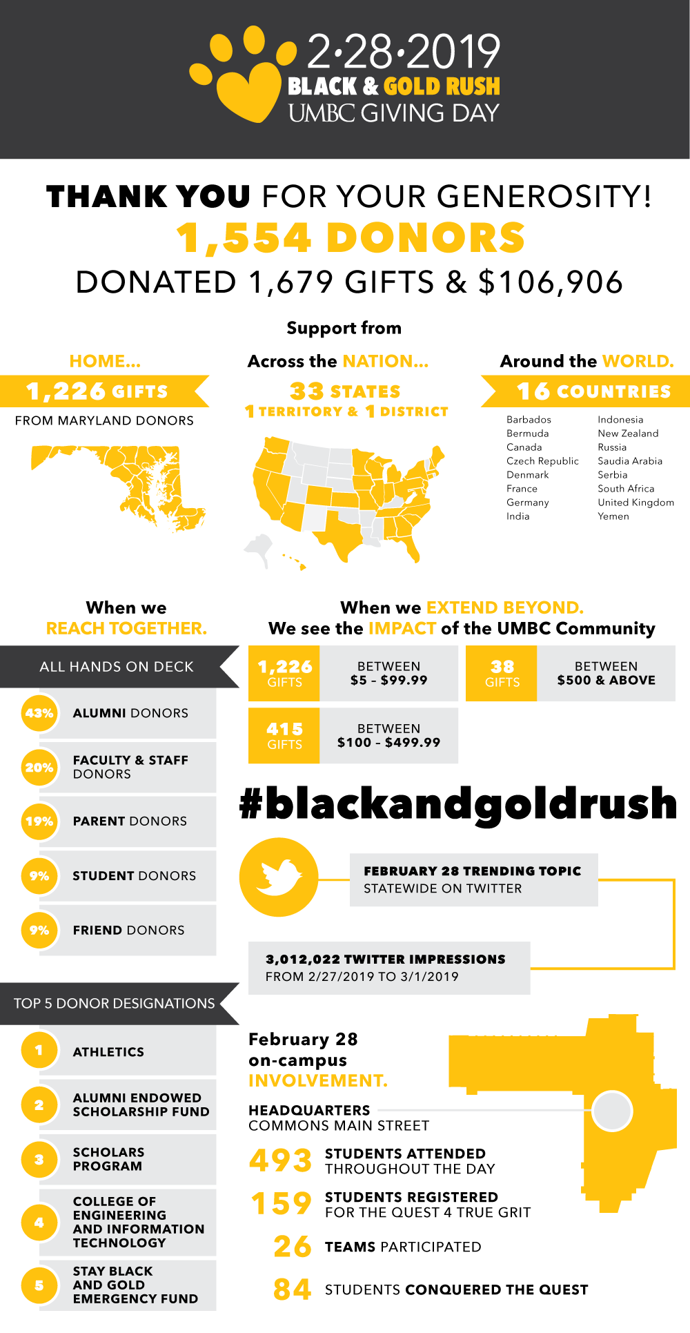 UMBC hosted it's first giving day on February 28, 2018 and has continued the tradition of hosting our annual giving day the last Thursday of the month of February. During this campaign to not only raise money, but to also increase donor engagement, multiple assets across print and digital media were created including infographics, social media graphics, Snapchat filters, flyers, posters, stickers, banners, billboards, and more. Follow the progress of our giving day every February at givingday.umbc.edu and on Facebook and Instagram.